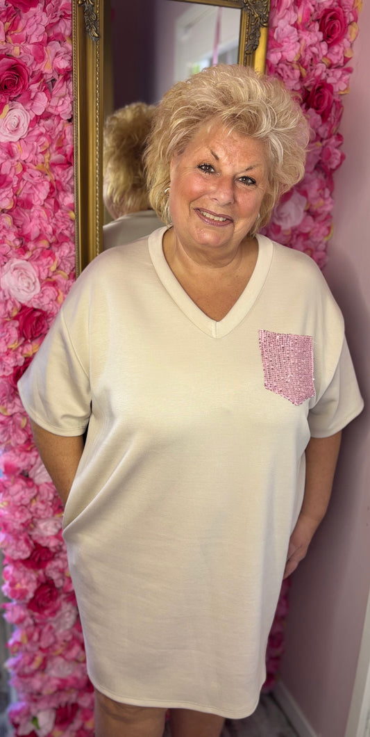 Lang T-shirt/T-shirt Jurk met Pailletten Beige Maat 48 t/m 54