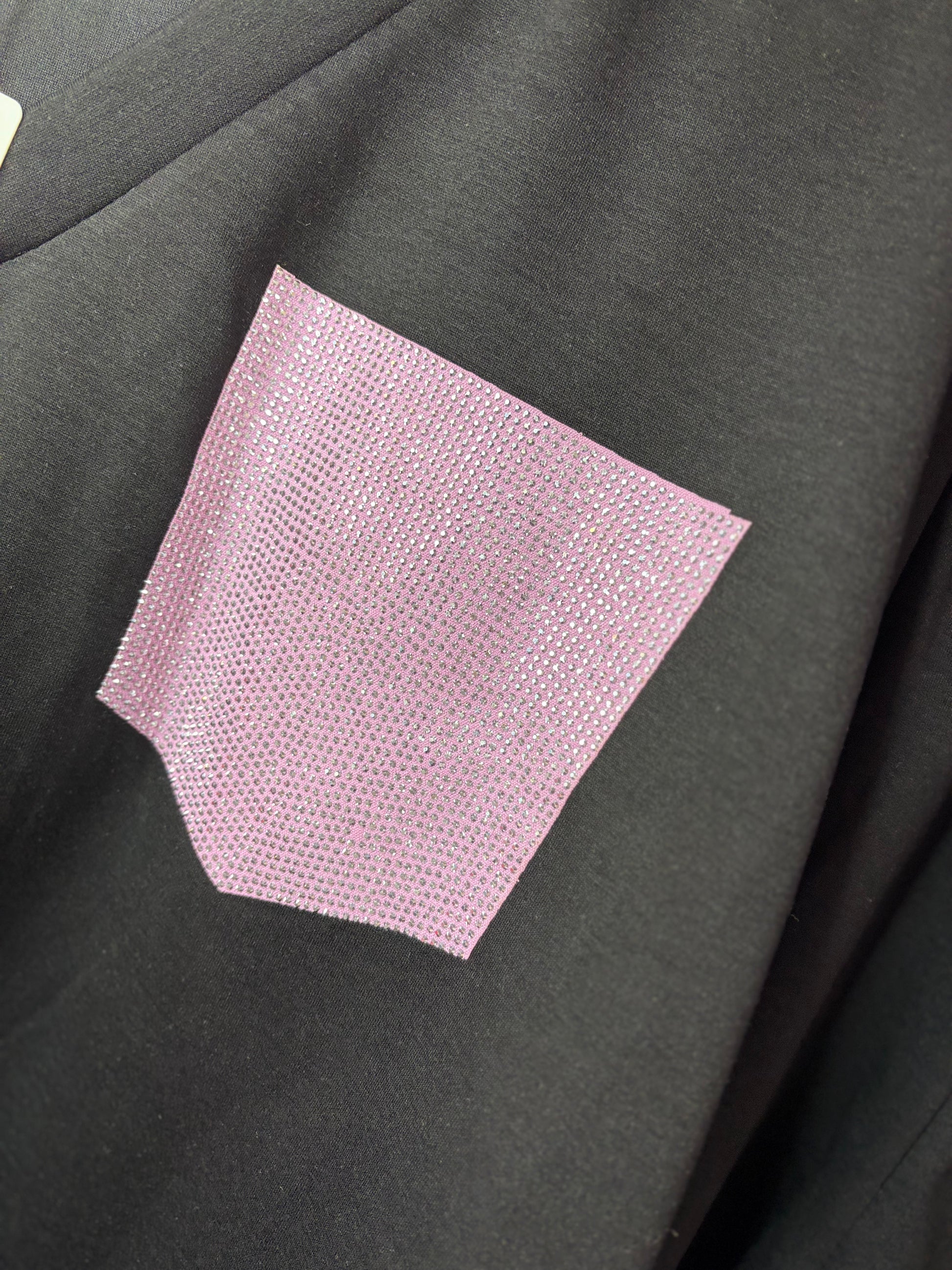 De borstzak op het shirt en de kontzak van de broek zijn afgewerkt met prachtige roze bling steentjes.