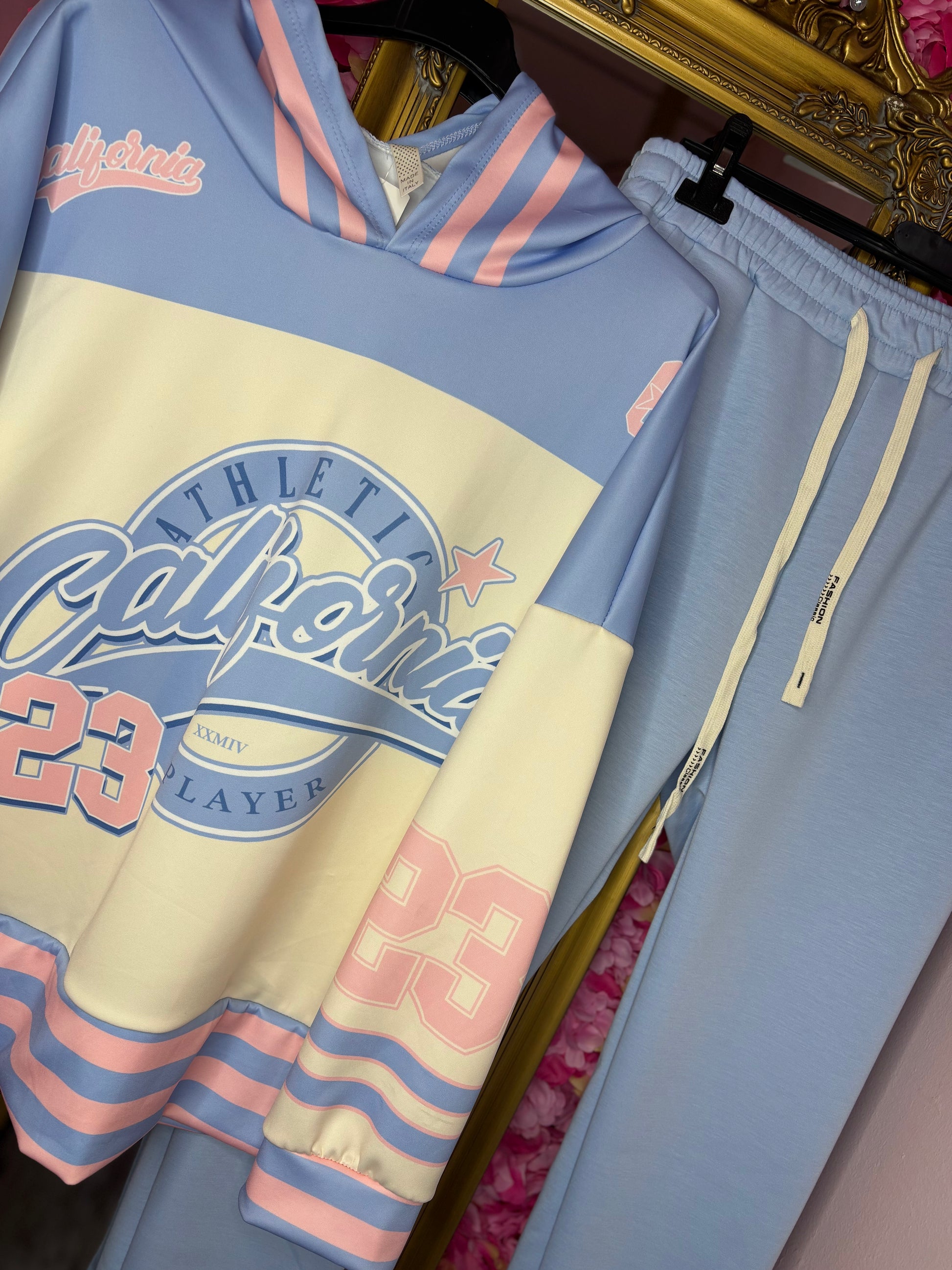 Deze mooie set speelt met de trendy kleuren, zacht blauw en roze, en wordt compleet gemaakt door een stoere base ball-inspired print die net dat rebellische randje geeft.
