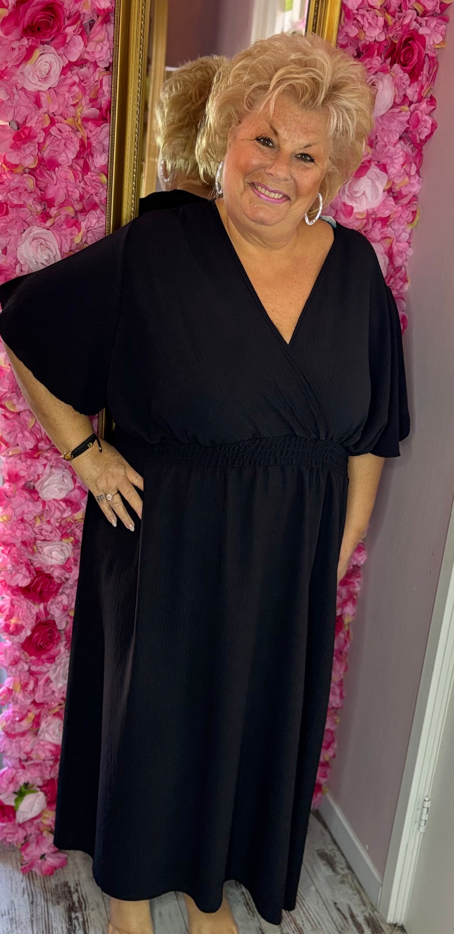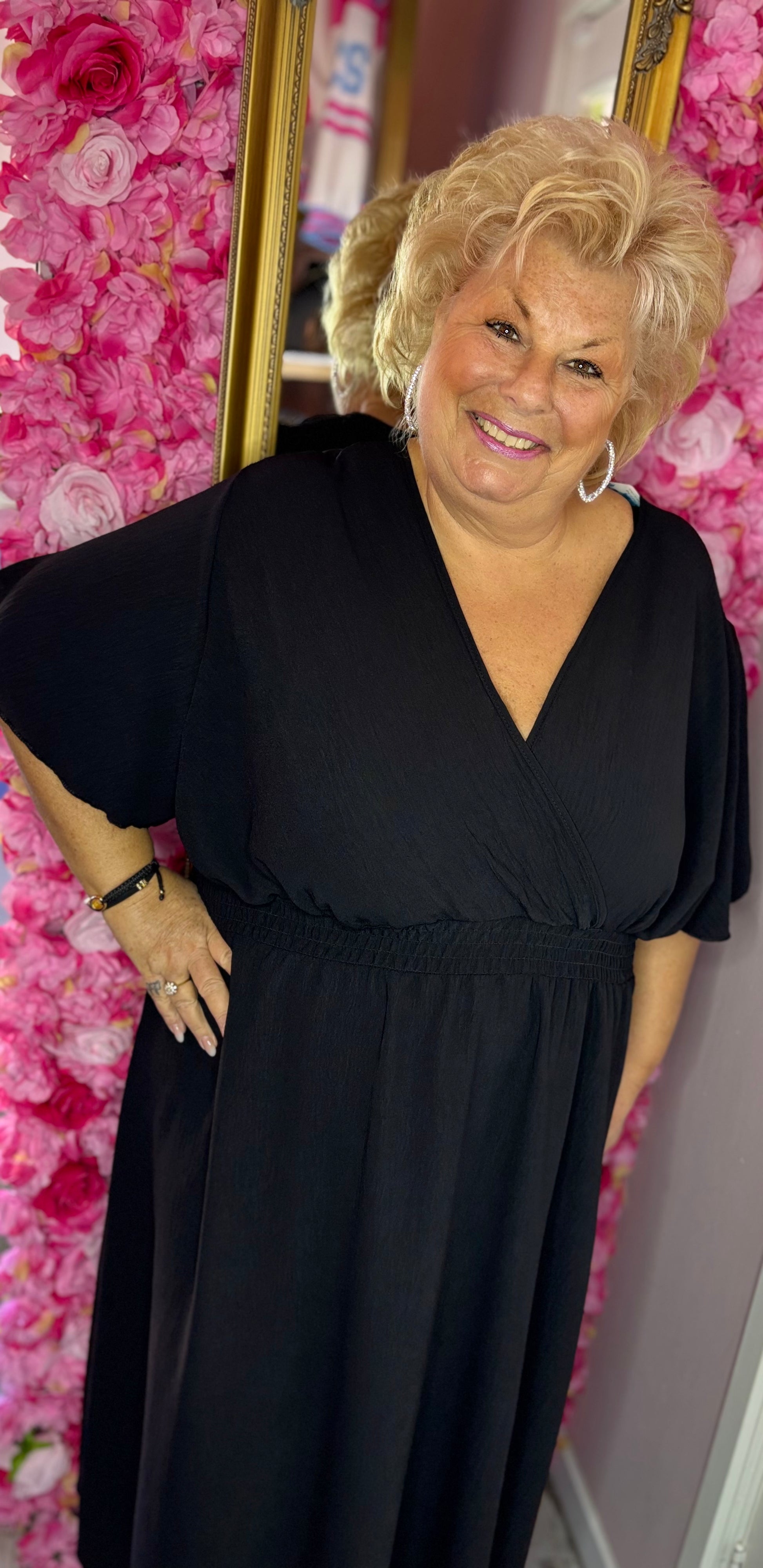 De elastische taille zorgt voor een heerlijke fit, terwijl de bovenkant mooi valt in een V-hals met een lichte overslag, super flatterend en vrouwelijk.