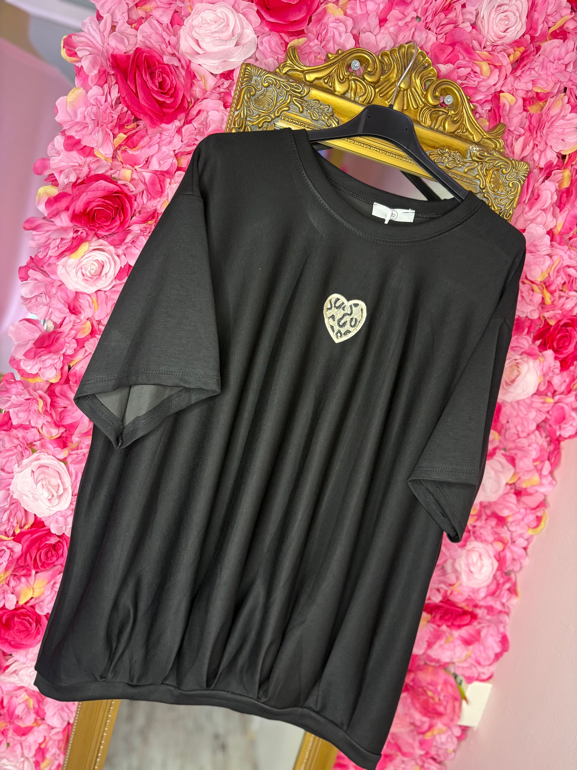 Het shirt heeft korte mouwen, een ronde hals en als leuk detail een hartje op de borst in panterprint.