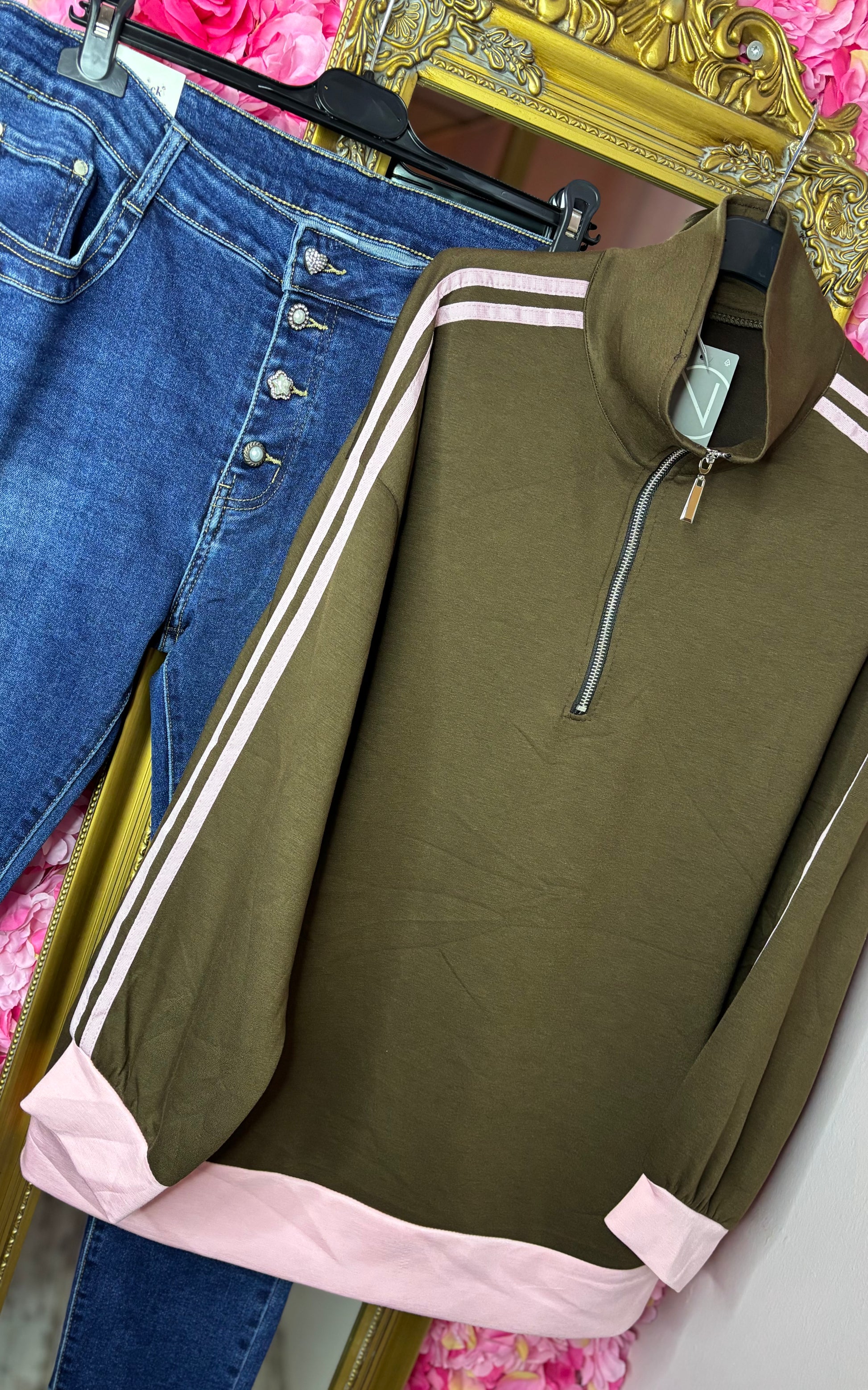 De hoge kraag met rits maakt ‘m extra veelzijdig: draag ‘m dicht voor een cozy vibe of open voor een meer casual look.