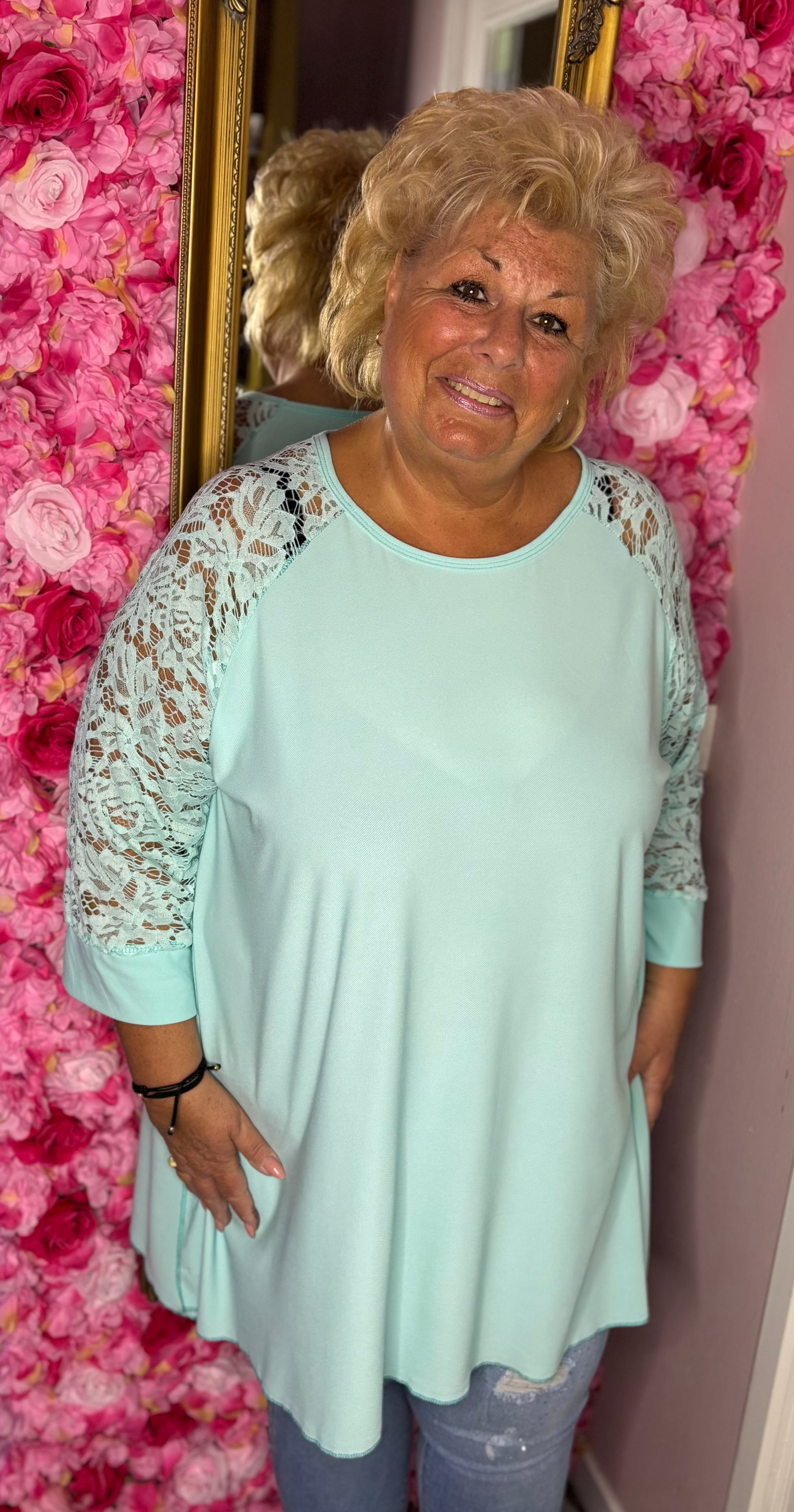 Deze tuniek heeft kanten mouwen voor een vrouwelijk en elegant accent.