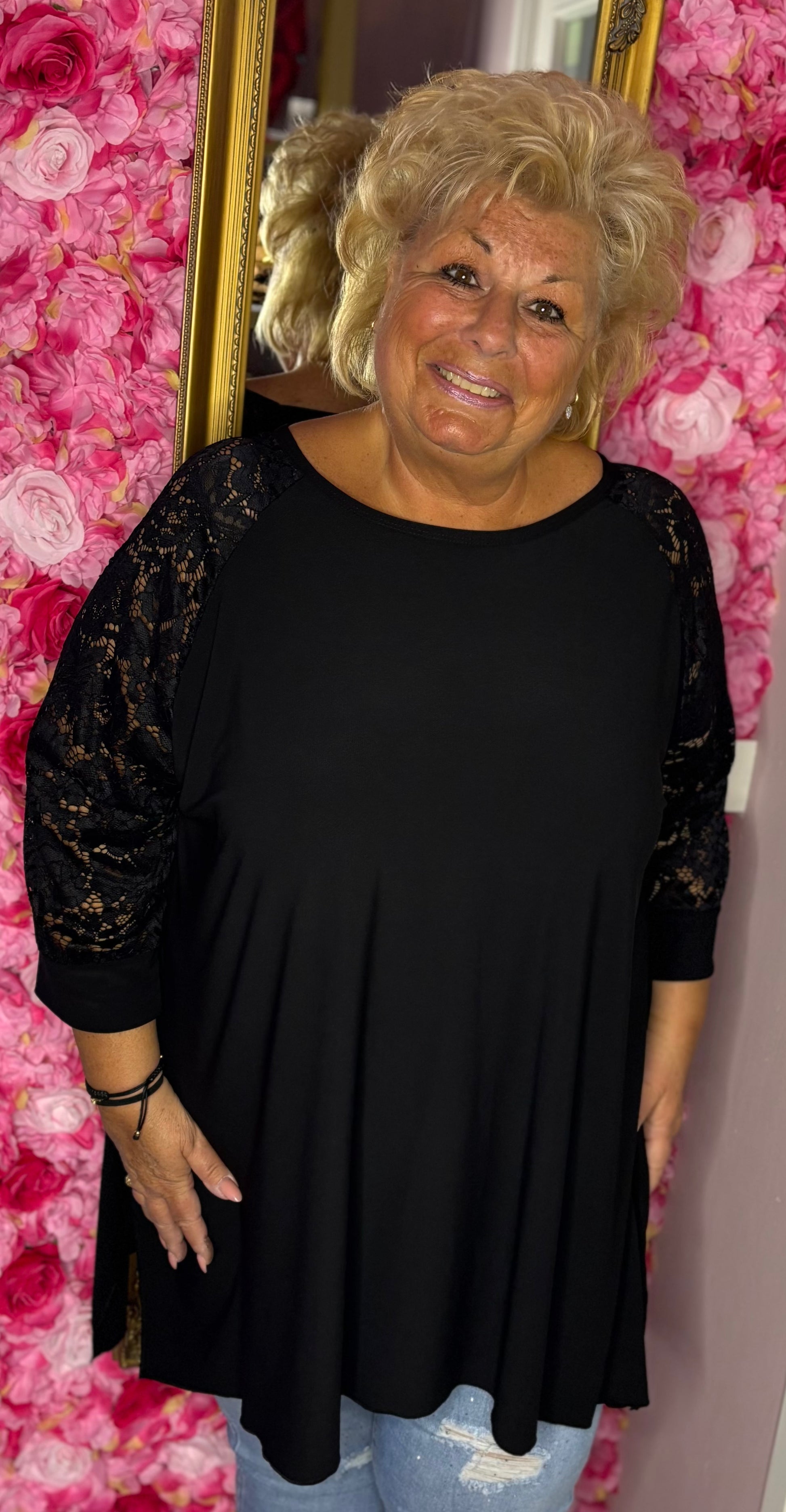 Deze tuniek heeft kanten mouwen voor een vrouwelijk en elegant accent.